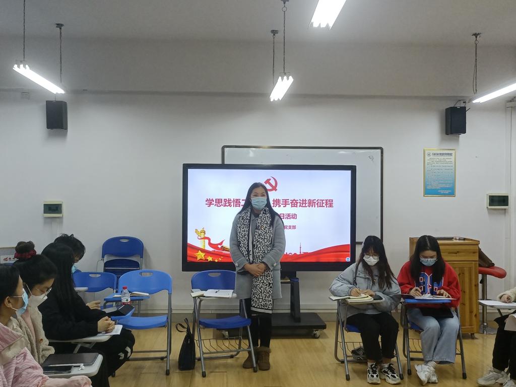 活动伊始,邓洁琼同志介绍了本次党日活动的主题。接着4名同志依次就党的二十大这一主题进行发言。其中,揭琪同志提到,党的二十大总结了过去五年的工作和新时代十年的伟大变革,在党的领导下,人民当家作主,生活改善,我们也应撸起袖子加油干,推动发展新进程。贾世榕同志提到,党的二十大报告指出“当代中国青年生逢其时,施展才干的舞台无比广阔,实现梦想的前景无比光明”。她表示,作为一名大学生,我们要坚定理想信念,努力学习政治理论知识和科学文化知识,积极参与社会实践活动,做好理论和实践的相结合,科学规划自身发展,以青春热血铸就青春中国。发言完毕,邓洁琼同志提出,我们要通过“学思践悟”进一步学习贯彻好党的二十大精神。作为一名英语专业的学生,我们应坚定文化自信,充分发挥外语专长,讲好中国故事,让中华优秀文化走向世界。作为一名党员,我们应做好同学们的“知心人”、“贴心人”和“引路人”,为同学们答疑解惑和排忧解难。同时,我们应坚定不移听党话、跟党走,做有理想、敢担当、能吃苦、肯奋斗的新时代好青年。