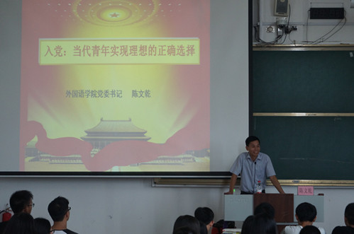 会上,陈书记深入地介绍了党的基本知识教育的主要内容,并从党的基本知识教育的重要性等方面向同学们阐述了入党是当代青年实现理想的正确选择,最后向大家介绍了大学生申请入党的要求及方式。陈书记幽默风趣的话语风格颇受学生喜欢,在座每一位学生都受益匪浅。