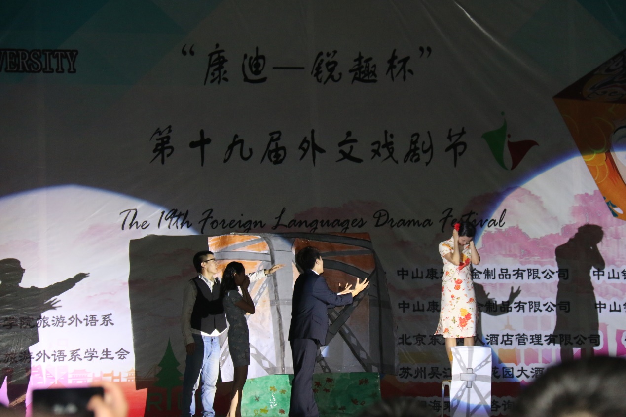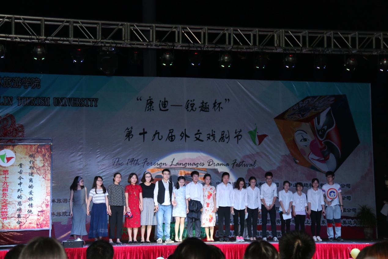 2016年5月27日,在我院英日语戏剧节中摘冠的《Romance in the Rain》节目剧组人员(英语13-1班)应邀前往桂林旅游开元(中国),在贵院第十九届外文艺术节进行交流表演。