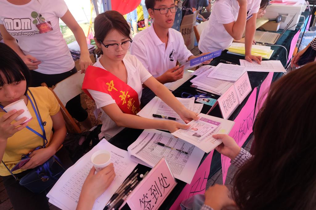 迎新工作一开始学生党员在大本营迎接2016级新生入学的工作热火朝天地展开,他们秉承着“一名党员就是一面旗帜”的信念,通过配戴“中共党员”标示牌和“中共党员先锋岗”绶带等方式主动亮明身份,积极参与迎新工作,以自己的行动把“做合格党员,当迎新先锋”的理念践行到迎新工作中来。他们有的向前来报到的新生和家长介绍学校情况,有的为新生搬运行李,有的引导新生办理入学登记手续,在广大师生中树立了认真负责、服务奉献的党员先锋形象。