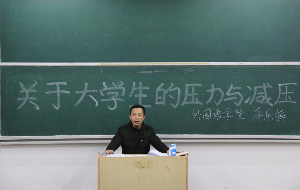 在讲座上,蒋乐梅老师从压力的主要来源、为什么要减压以及如何减压这三个方面进行叙述。他提到大家的压力主要来自于学习和就业,每个人都有压力,但我们要学会正确对待;接着他又详细的向大家介绍了压力的益处和危害,并告诉大家一些实用的解压方法和学习的建议。他告诉大家要树立目标,学会制定计划,并努力完成计划,要善于解决主要矛盾,时刻保持良好的心态。并且他还引用了江本胜的“水的实验告诉我们”向大家展示了正能量的重要性,提倡同学们要怀着善心,朝着好的目标前进,做一个富有正能量的人。讲座最后,钟立军老师为本次讲座进行总结。