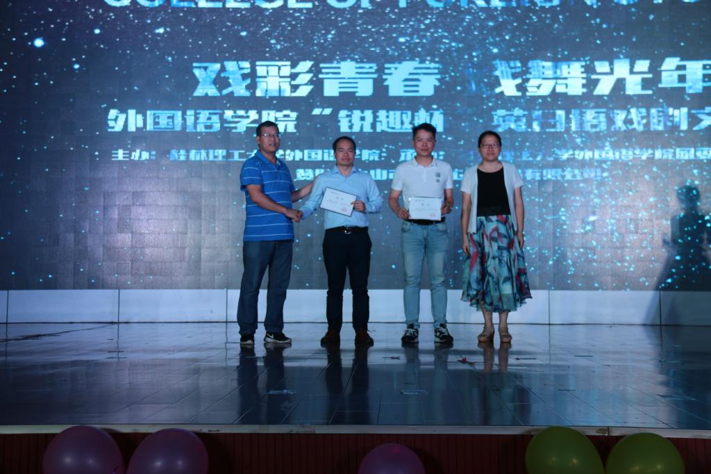 在“锐趣杯”英日语戏剧节开之前,开元(中国)党委副书记江玲、副院长胡金为中山锐趣工艺礼品有限公司联合创始人(董事)柏国锐、陈侯春先生颁发桂林理工大学大学生企业导师聘书。