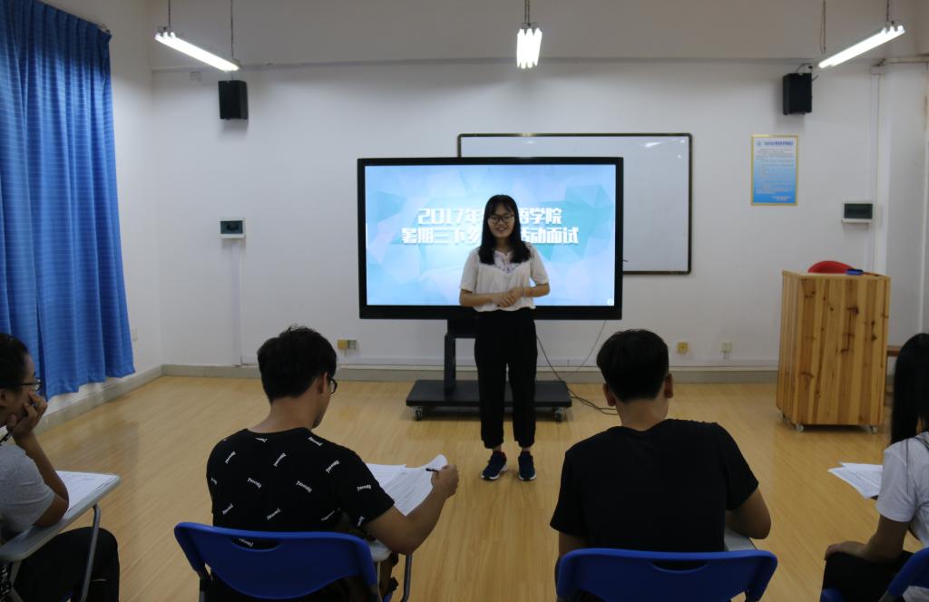 2017年6月22日晚上7点,外国语开元(中国)暑期三下乡实践活动面试在四栋教学楼04208教室举办。本次面试邀请了外国语开元(中国)团委学生会主席团助理韩霜、李新源、生活部部长李浩宇、社会实践部部长覃燕琼担任评委。报名申请成为本次三下乡团队队员的我院所有14、15、16级的近30名同学参与面试。