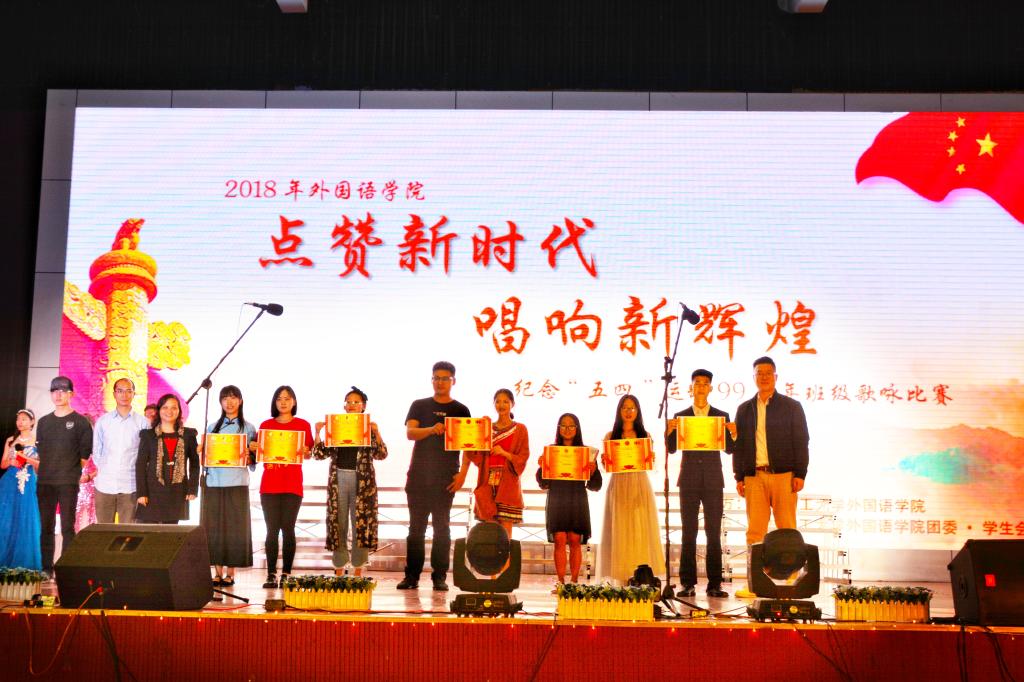 本次比赛以赛前各班抽签进行表演,评委对其表现根据评分准则进行打分,并选出优胜班级为比赛规则。伴随着主持人热情洋溢的开场献词和我院艺术团精彩的开场歌曲,歌咏比赛在同学们的掌声中拉开帷幕。我院党委副书记江玲为比赛进行致辞,她激励同学们继承“五四”精神,勤奋学习拼搏进取,同时预祝比赛取得圆满成功。在比赛中,各参赛班级着装整齐、创意倍出、热情饱满,同学们怀着满腔的爱国热情,用嘹亮的歌声,唱响青春的旋律。表达了对“五四”精神的缅怀,展现了我院学子朝气蓬勃、奋发进取的精神面貌。台下观众热情高昂,我院团委学生会艺术团的串场表演以及易班抽奖活动更是进一步点燃了现场氛围,全场掌声和喝彩声持续不断。经过激烈的角逐,英语15-3班以一首热情洋溢的《爱我中华》荣获一等奖,日语16-2班《红歌串烧》歌曲和英语16-2班《奉献》歌曲荣获二等奖,英语17-5班《明天会更好》歌曲、英语17-2班《映山红》歌曲和英语15-1班《我和我的祖国》歌曲荣获三等奖,英语16-4班金颖洁荣获最佳指挥奖,分别由我院英语教研室教授黄廷慧、院长助理曾文华、英语教研室副主任彭奉天及我院团委书记钟立军为其颁奖。