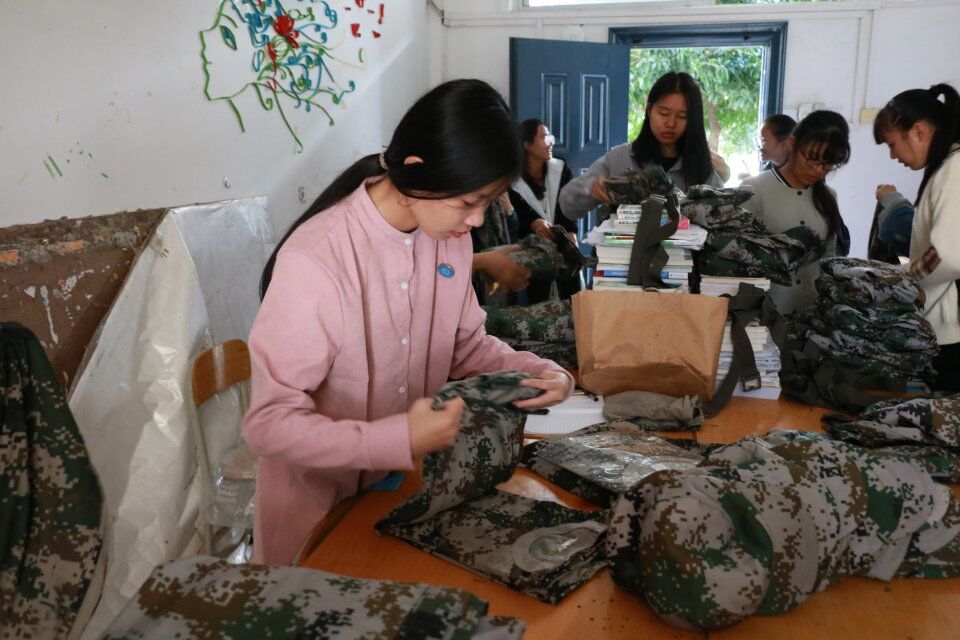 紧接着,成员们将满满的收获提到4B的学生之家进行分类整理。大家将分类好的服装分别整齐划一地装在各个袋里,整齐的军训服,折叠衣物的双手,溢出的爱心,无一不彰显着温情。