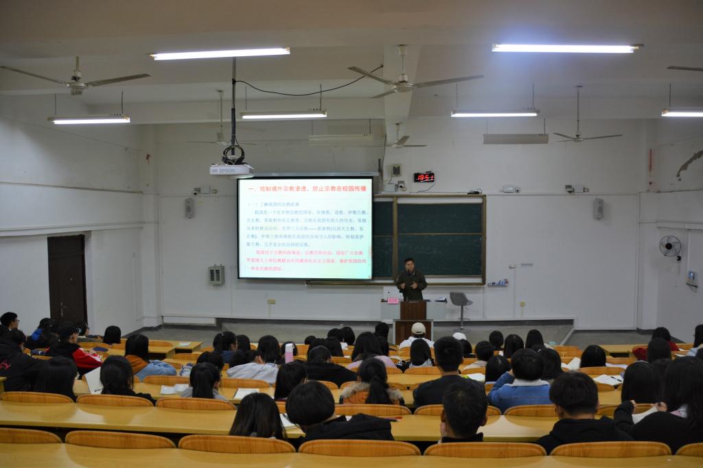 讲座上,党委书记陈文乾围绕意识形态从两个方面进行阐述:一是抵制境外宗教渗透,防止宗教在校园传播;二是认识意识形态的本质,提升自身意识形态能力。陈书记结合我国现状,为同学们介绍了我国的宗教类型和历史,并指出我国的宗教政策是宗教信仰自由、团结广大宗教界爱国人士和信教群众共同建设社会主义国家以及维护祖国的统一和各民族的团结。其次,党委书记陈文乾就学生干部的定位和意义做了深刻解读,举例说明了作为学生干部应该以怎样的意识形态对待工作,强调学生干部要严格要求自己,努力加强自身建设。最后,团委副书记赵思聪进行总结,她表明学生干部更应该严于律己,提升信息研判能力,做到学习与工作两不误,并保持积极乐观的态度,做一个全面发展的优秀学生干部。