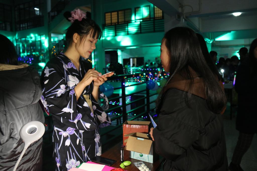 伴随着音乐的响起,由我院舞蹈队带来的青春活泼的舞蹈《恋爱循环·恋爱サーキュレーション》和声乐队动听的歌曲《画沙》点燃了现场气氛,为本次活动正式拉开序幕。活动开始,主持人首先为同学们讲解活动规则,本次中外文化交流月日语第二课堂展示活动以各宿舍为单位组织游戏店和模拟店,由现场的观众进行对心仪店铺的投票,最终综合票数以及嘉宾老师的评分来评选出优秀宿舍模拟店。各个模拟店前人气高涨,同学们体验着各种有趣的小游戏,同时在日本文化体验馆还有和服体验环节,活动现场热闹非凡。活动中还穿插着各个社团的精彩表演,给同学们带来了一场精彩绝伦的视听盛宴,有着丰厚奖品的许愿树抽奖环节更是将活动推向了高潮。最终,获得一等奖的是4B501宿舍,由我院院长助理曾文华为之颁奖;获得二等奖的是4B218和4B219宿舍,由我院日语教研室主任覃霄为之颁奖;获得三等奖的是4B303、4B306和4B506宿舍,由我院日语教研室副主任邓圆为之颁奖。