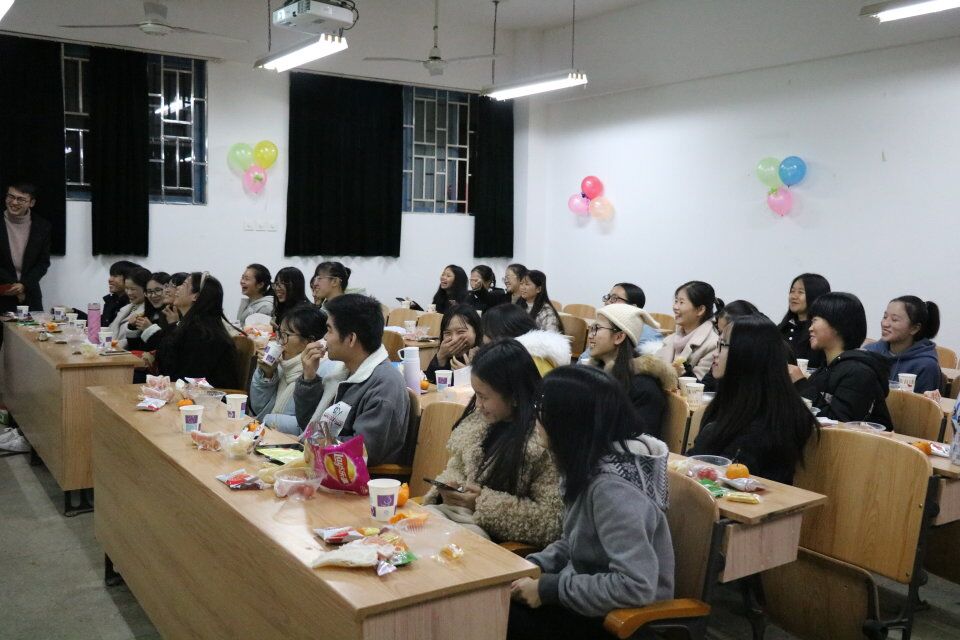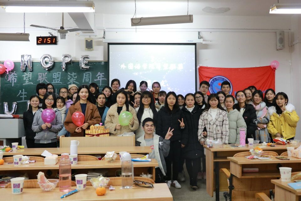 晚7点,部长级以上成员即到活动现场布置场地。半小时后,18届全体成员陆续到达并共同完成场地布置。一个个气球承载着一份份喜悦,一份份零食又寄予着沉甸甸的祝愿。晚8点10分,七周年视频集拉开了周年庆活动的帷幕,全体成员一起回顾社团的成长历程,一张张图片见证了希望联盟一直以来的努力。紧接着,各个部门各展其神,岁月神偷,看云淡风轻;语言朗诵,现中日英之美,方言之韵;校园小品,乃师生融洽……在场同学们沉醉其中,拍手称赞,笑声不断。期间,还有小游戏“你划我猜”、“你是我的眼”、“造反游戏”等等,大家都热情积极参与,整个教室洋溢着一种欢乐的氛围,欢笑声经久不息。随后,全体成员共唱一曲社歌《和你一样》,共品七周年生日蛋糕,周年庆顺利拉下拉下帷幕,待收拾完场地后同学们依依不舍离开。
