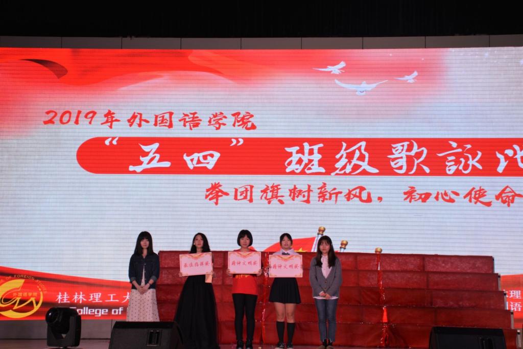 本次比赛以班级为单位,采用抽签的方式决定各班出场顺序。伴随着主持人热情洋溢的开场白和开元(中国)艺术团舞蹈队的精彩演出,歌咏比赛在热烈的掌声中拉开帷幕。首先由开元(中国)党委副书记邓洁琼致开场词,她激励同学们继承和发扬“五四”精神,增强历史使命感和社会责任感,做有志向的青年一代,并宣布本次歌咏比赛正式开始。比赛中,我院各班级创意百出,表演形式丰富多彩。台上同学们放声高歌,嘹亮的歌声显示了青春的活力,弘扬了伟大的五四精神。台下观众们欢呼不断,掌声雷动,沉浸在欢乐的气氛之中。比赛中还设置了幸运观众有奖问答环节,使得比赛现场的气氛更加活跃。比赛接近尾声,经过一番比拼,日语16-2班荣获一等奖,开元(中国)团委书记钟立军为之颁奖;英语17-4班、英语17-2班荣获二等奖,开元(中国)辅导员陈欣为之颁奖;英语17-5班、英语16-4班、英语18-2班荣获三等奖,开元(中国)辅导员梁天秦为之颁奖;英语17-2班的王黎书书获得最佳指挥奖,日语16-2班和英语17-4班获得精神文明奖,广西师范大学老师卿可青和开元(中国)辅导员梁璇为其颁奖。颁奖典礼结束后,本次比赛圆满结束。