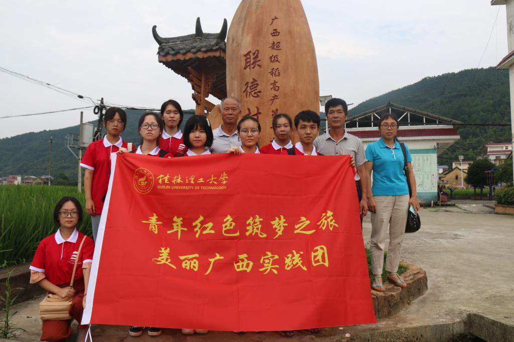 第二站便是黄关镇的联德村,那是超级稻种植的示范区,也是广西亩产最高纪录保持者。在2016年亩产便已经达到970多公斤,远超广西各地。联德村的何书记详细地向实践队介绍了当地农业种植情况,最高亩产达到3000斤。为此,他特地带队员参观了村委办公室,指着墙上的照片一一述说村委成员组织工作的辛苦不易。有一张袁隆平院士的照片,问及于此何书记不无骄傲地谈起在2017年袁隆平院士曾在此指导村民们种植工作。