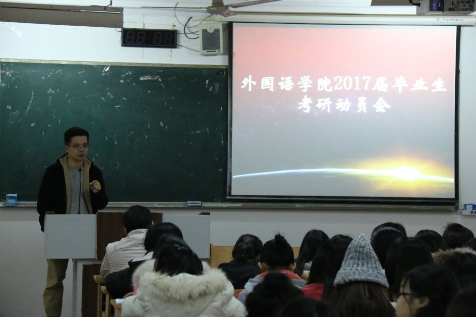 会议在我院党委副书记江玲老师的讲话中拉开了序幕,她向同学们讲述了自己的考试经验并且鼓励2013级学生轻松准备、迎接考研。全克林院长向学生们阐述考研的重要性,并指出了考研是一次人生转折的机会,同学们应抓住机会,努力坚持下去力争好的成绩。胡金副院长与同学们分享了现今社会中的就业形势,鼓励同学们参加考研。随后,亢江瑶老师和曾文华老师分别对针对英、日语专业同学做了考研与就业的详细分析,并就同学提出的问题现场作答。
