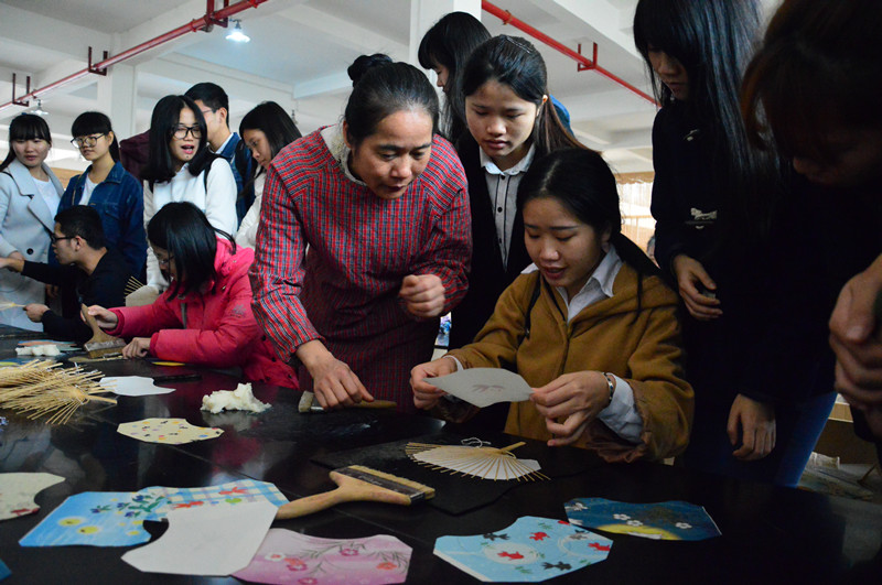 当日上午10点顺利抵达目的地后,企业负责人邱燕珍热情的招待了老师学生们一行的到来,并给学生们耐心详细的介绍了工厂的发展历史以及工厂所生产的团扇的历史文化知识。随后,她又带领同学们参观了团扇的生产作坊,并在每一个流程和团扇制作环节都给学生们做了讲解;参观结束后,为了让学生们更好的了解团扇的生产制作过程,她又给同学们亲自动手实践体验团扇的生产制作,同学们也纷纷积极的参与其中。团扇制作实践体验持续到中午12点,工厂企业参观也顺利结束。