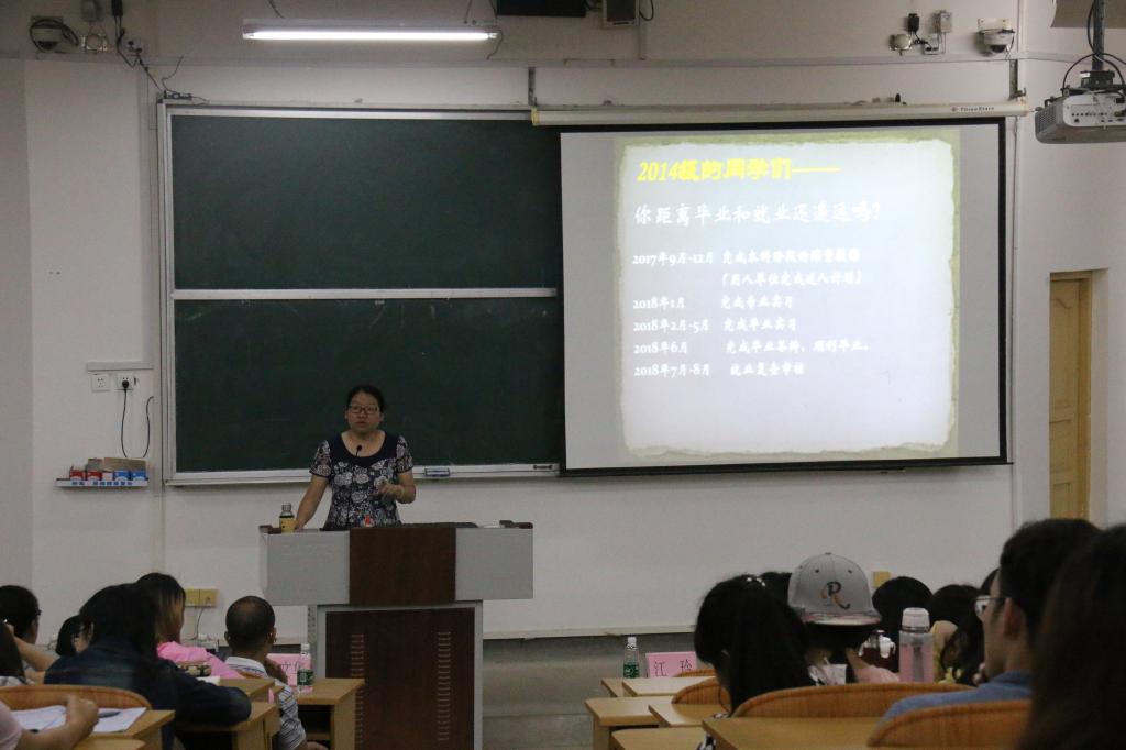 2017年5月15日晚上7点,我院2017年考研动员大会在雁山校区05308教室举行。我院党委副书记江玲,副院长胡金,以及赵思聪、亢江瑶、覃霄、彭奉天、13级优秀毕业生江蓝梦、陆秋园出席了活动,我院全体14级学生参加了这次会议,会议由日语教研室主任曾文华主持。