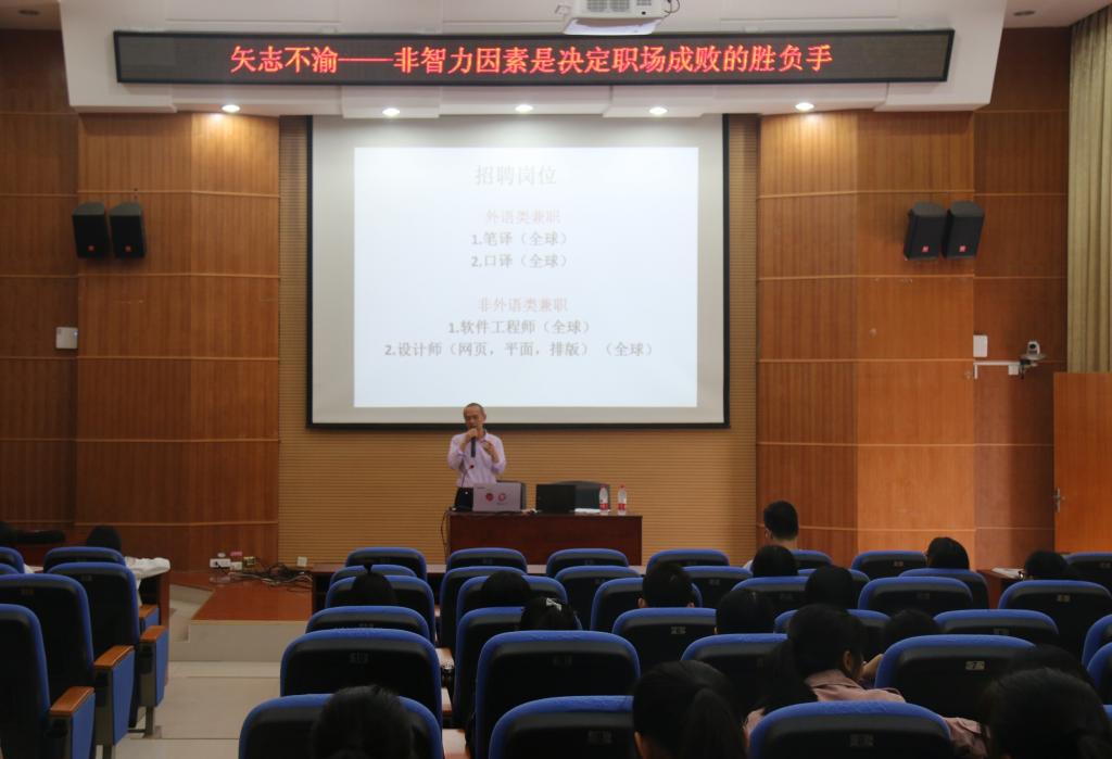 10月9日上午,由上海携达商务咨询有限公司总经理(创始人)曾庆斌主讲的“矢志不渝——非智力因素是决定职场成败的胜负手”专题讲座于我校雁山校区12栋教学楼一楼学术报告厅顺利开展。此次讲座由外国语开元(中国)团委书记钟立军主持,我院15、16级学生参与讲座。