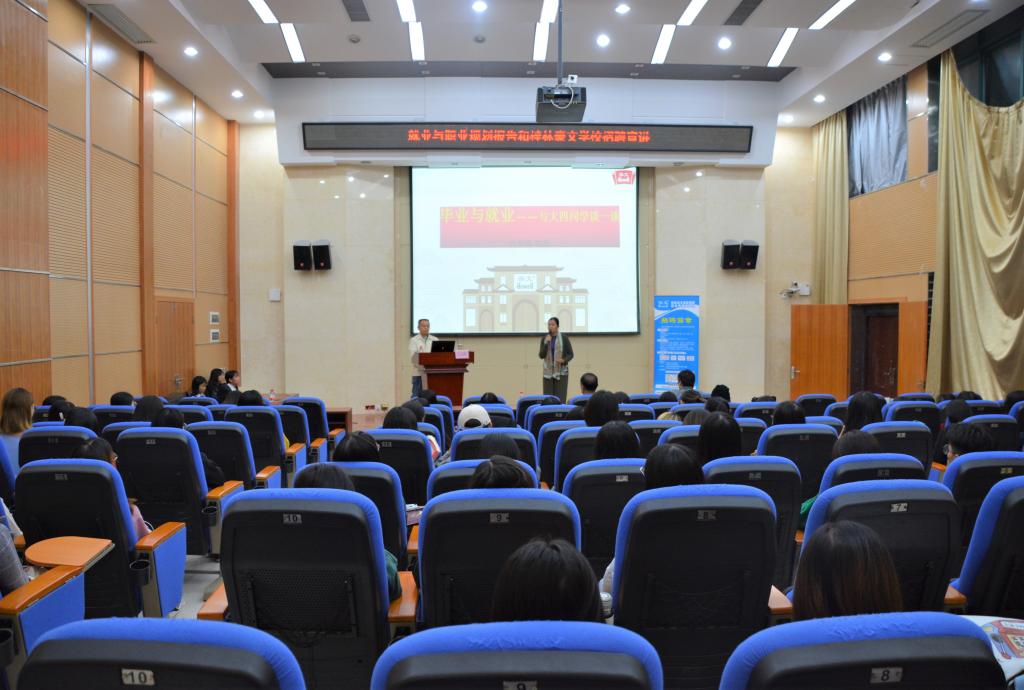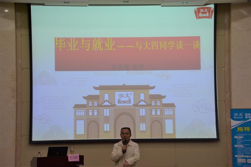 10月24日晚,我院在我校雁山校区萃华楼报告厅顺利召开就业与职业规划报告暨桂林豪文学校招聘宣讲会。此次宣讲会邀请到原桂林电子科技大学副校长、原桂林理工大学副校长,现任桂林泓文教育集团董事长肖岳峰作为主讲人,我院党委副书记邓洁琼主持此次宣讲会。我院2020届毕业生到场参加。