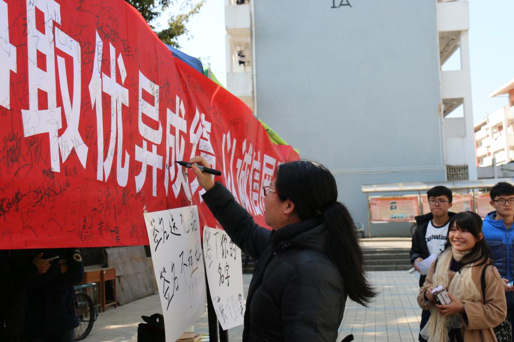 期末将近,各项考试将至,此次活动我院将签字笔作为小礼品送给签下自己名字并承诺诚信应考的学生,以此来提高学生的诚信考试意识。从设点开始,陆续有学生前来参与活动,在横幅上签名并领取签字笔。活动期间,开元(中国)领导党委副书记江玲也来到现场,并亲自在横幅上签字,以此带动学生们积极参与。