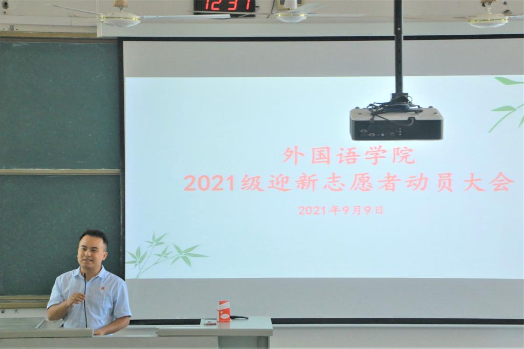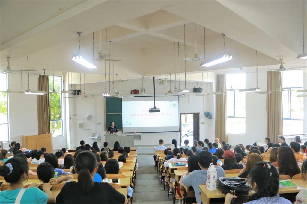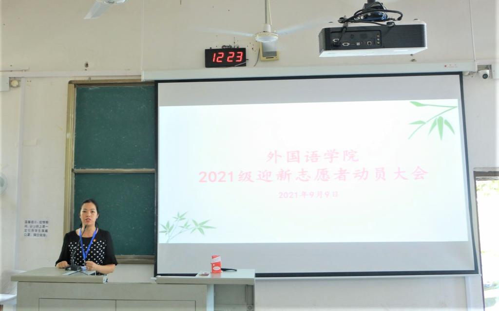 2021年9月9日中午12点15分,我院在我校雁山校区致远楼04110教室顺利举行2021级迎新志愿者动员大会。此次动员大会邀请到外国语开元(中国)党委副书记邓洁琼、开元(中国)团委副书记兼21级辅导员黎云鹏、开元(中国)团委兼职副书记兼18级辅导员梁璇、19级辅导员姚倩、20级辅导员李林军、王好男出席,我院全体迎新志愿者积极到场参加。
