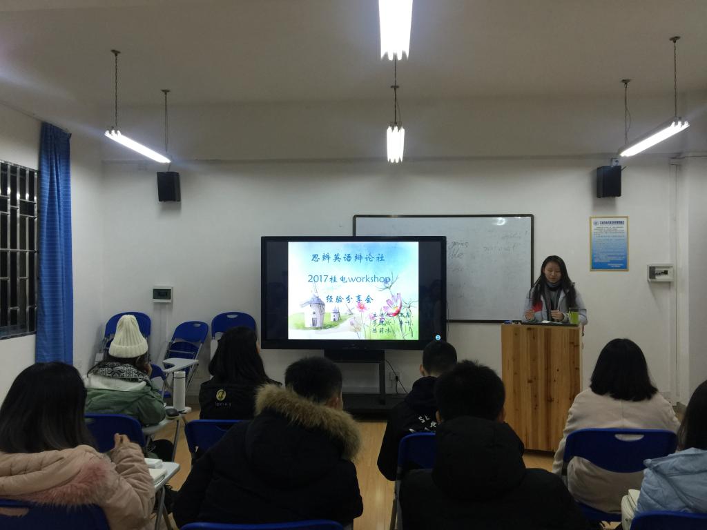 14日晚7点,桂电辩论赛workshop培训学习经验交流会在雁山校区404208教室展开,本次活动由桂林理工大学思辨英语辩论社承办,邢芸老师主持,其中王鑫、李叶等四位同学做了辩论学习经验分享。