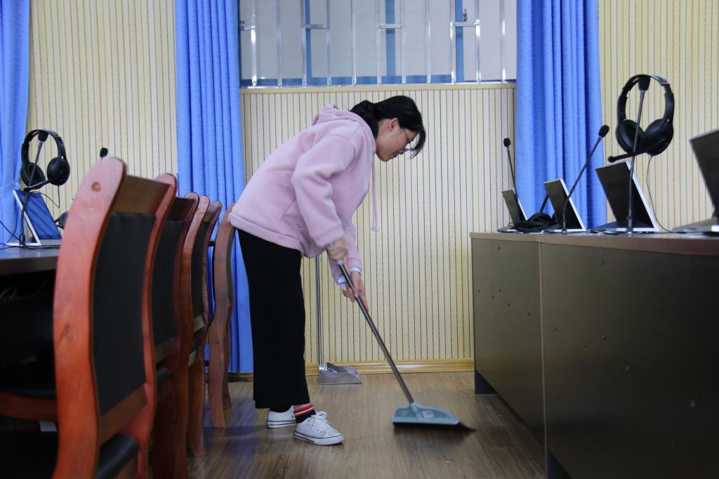 活动开始前,志愿者们带着清扫工具准时到达四栋广场集合。在秘书处点名完毕后,各小组长带领组员到达指定楼层开始清扫工作。活动过程中,小组成员分工明确,积极主动地擦拭桌子、椅子以及电脑等公共教学用品,并且完成清扫地面垃圾的任务。成员之间相互配合、团结协作,用自己的行动诠释出助人为乐的志愿精神。清扫结束,志愿者们将教室物品摆放整齐。最后,活动负责人确认所有教室都被清扫干净并组织志愿者们签退,此次清扫语音室活动圆满结束。