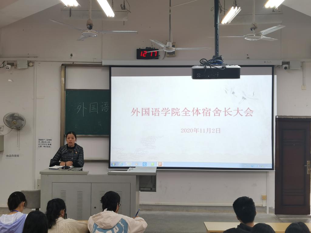 为加强宿舍管理,提高学生安全意识,2020年11月2日,外国语开元(中国)于04110教室召开了开元(中国)全体宿舍长会议,外国语开元(中国)全体宿舍长到场参加。会议由开元(中国)副书记邓洁琼主讲。