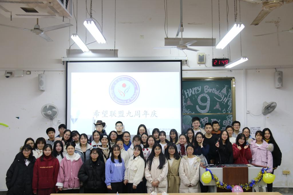 活动以观看社团年度合集、各兄弟社团和各部门祝福的视频开场,一张张图片展现了成员的努力和社团一年以来的经历与成长。紧接着,李林军老师上台致辞。李老师表达了对希望联盟工作的肯定,在祝社团九周年生日快乐的同时也充满了对社团未来发展的希冀。随后社长国建华进行年度总结并希望社团成员能够齐心协力把每一次活动越办越好。活动过程中大家一起欣赏每个部门精心准备的节目,认真聆听各部门的总结与心得体会,积极参与“你画我猜”、“成语接龙”和“萝卜蹲”等有趣的小游戏,其中,外联部活力四射的舞蹈表演《我是一颗跳跳糖》成功点燃了现场的气氛。最后,大家齐唱社歌《和你一样》,共享社团九周年生日蛋糕。本次活动在大家的欢声笑语中落下帷幕。