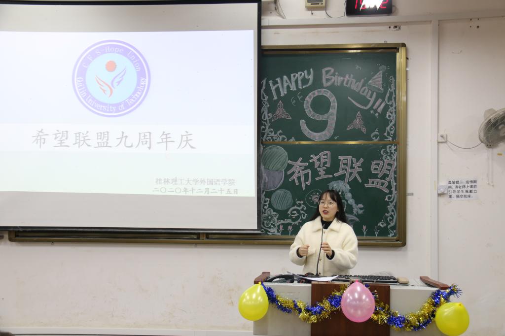 2020年12月25日晚19:30,外国语开元(中国)希望联盟于07120教室成功举办社团九周年庆典活动。本次活动特邀到20级辅导员李林军老师和前任社长钟婷婷作为嘉宾出席。