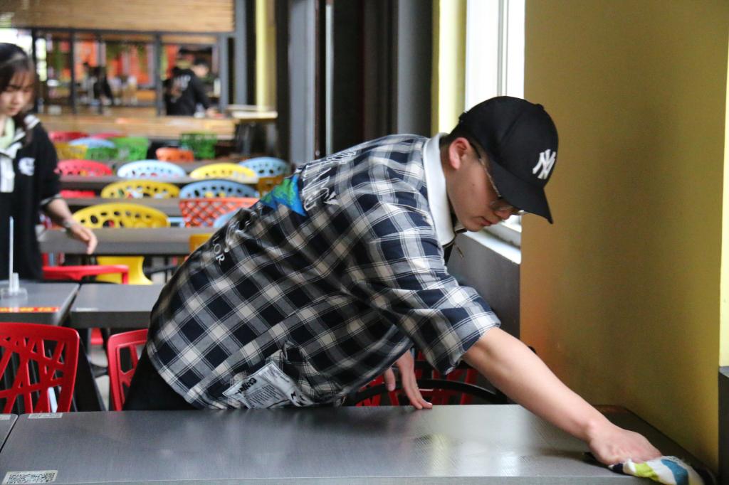 活动开始前,所有参与人员在三号食堂二楼集合,活动负责人进行点名签到并分配任务。随后志愿者们跟随组长前往指定区域进行清扫。活动过程中,志愿者们分工协作,相互配合,部分志愿者负责擦桌子,将饭桌的油脂擦拭干净;部分志愿者负责清理地板上的垃圾与污水;部分志愿者负责擦拭餐桌旁的花架;部分志愿者负责清扫食堂的楼梯道。当自己所在小组的任务结束后,志愿者主动去帮助没有完成任务的小组。最后,本次活动在志愿者们齐心协力的合作下圆满结束,三号食堂也在志愿者们勤劳的双手下变得更加干净整洁。