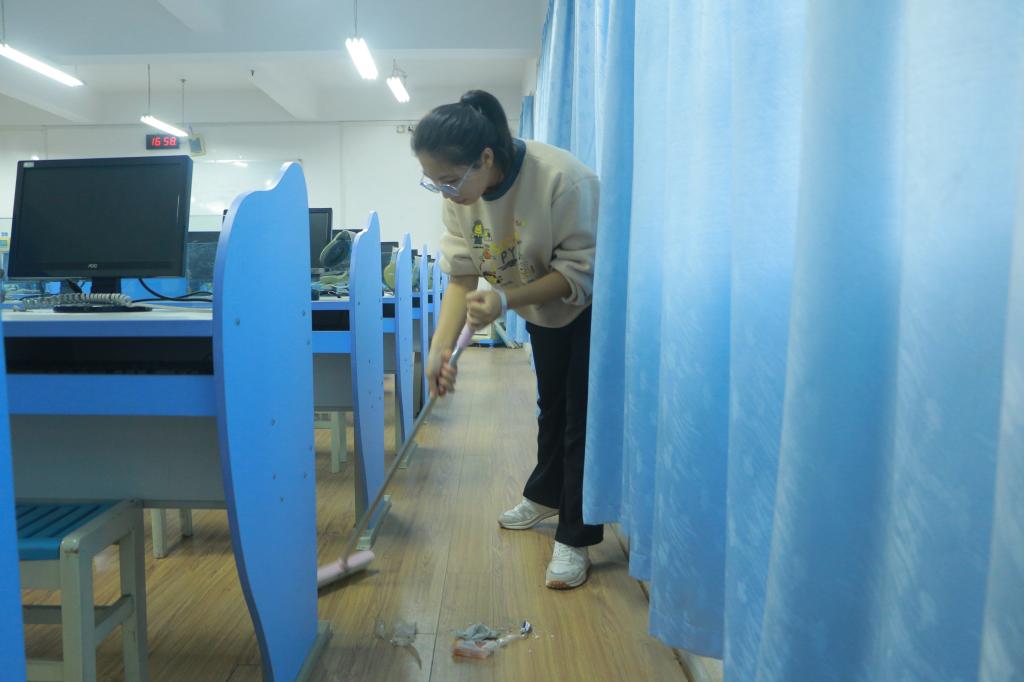 志愿者带着清扫工具在致远楼大厅集合。签到完成后,志愿者成员按照活动前期任务分配,由各小组长带领前往任务区展开活动。志愿者成员们手拿抹布,扫把等工具,认真清扫每一间教室,先打扫完的小组主动帮助未完成的小组,充分发扬了勤劳能干的志愿精神。忙碌的身影是最美的,经过大家的辛勤劳动,语音教室变得干净整洁。最后,志愿者们进行签退,活动到此圆满结束。
