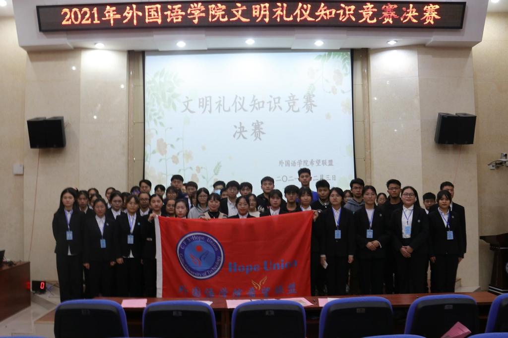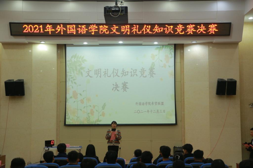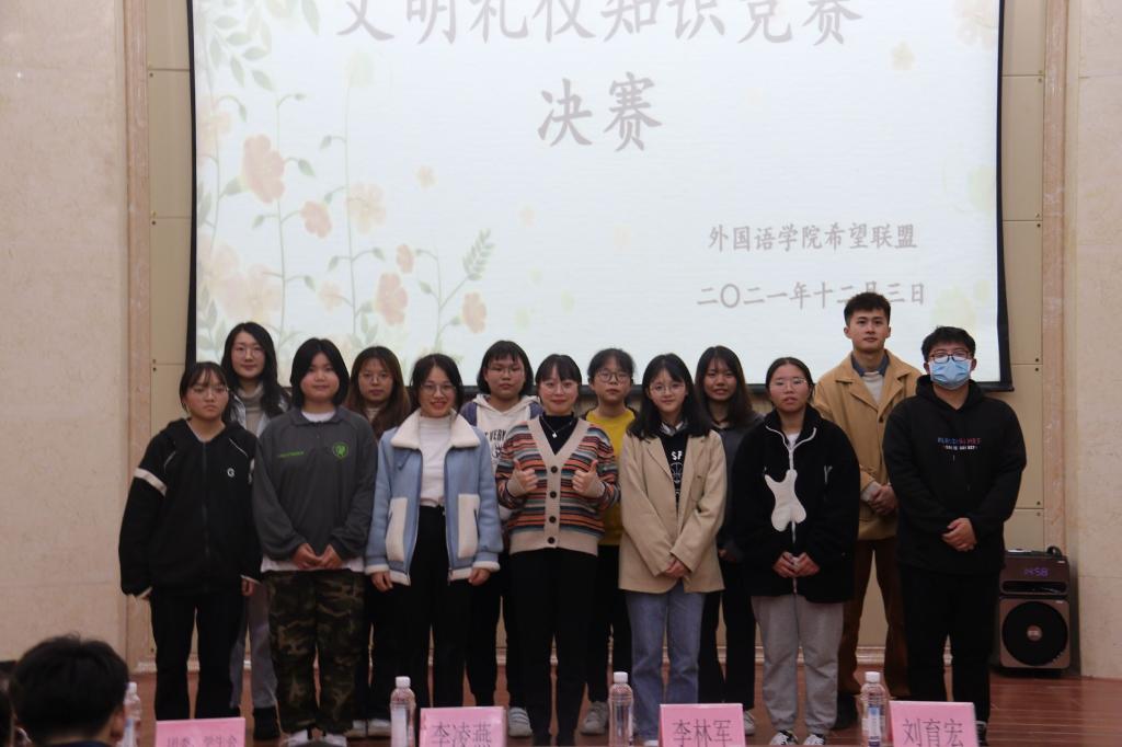 为进一步加强校园文明建设,传承优良校风和学风,2021年12月3日,我院希望联盟开展了以“扬中华礼仪,做文明学子”为主题的文明礼仪知识竞赛决赛。通过初赛的12名选手,组成为三支队伍进入决赛。
