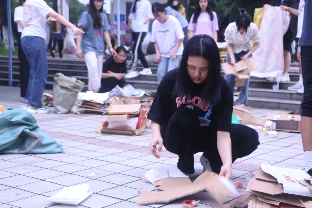 首先,志愿者们在三号食堂广场前集合,活动负责人进行点名签到和工作安排后,各组组长带领组员进入宿舍楼,分楼栋分楼层有序开展废品回收活动。活动过程中,志愿者们认真核对宿舍信息,礼貌敲门询问是否有废品需要回收。志愿者们在回收完废品后,帮忙打扫宿舍,确保了宿舍卫生整洁。对于不是本院或者没有人在的宿舍,各组组长记录相应宿舍门牌号,回到广场上报给活动负责人。率先完成任务的小组,在负责人的安排下,认真积极地帮助其他小组。废品回收完成后,志愿者们回到广场对废品进行分类整理,便于后期称重统计,最后,志愿者一起清扫广场,确保了校园的干净整洁,志愿者们开始依次进行活动签退。