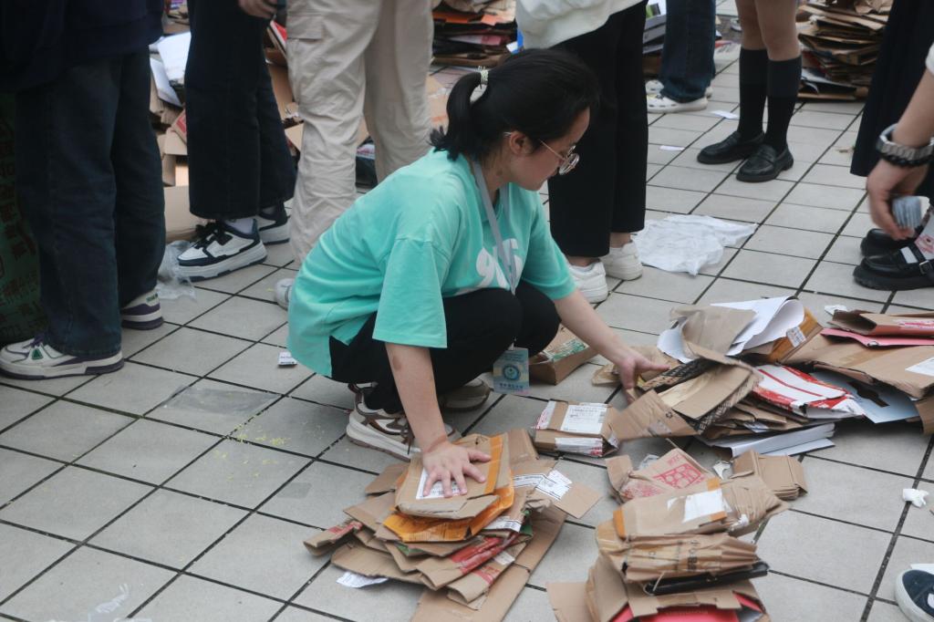 活动当天,每组组长带领小组成员领取完麻袋后,便前往各个小组负责的相应宿舍展开废品回收工作。在志愿者们礼貌敲门示意来意后,无论是否有废品需要回收,同学们都积极回应志愿者们。在活动后期,各个志愿者小组带着回收到的废品回到三号食堂广场进行分拣,志愿者们对废品仔细进行分类、整理、装袋,并清理好现场垃圾,本次活动圆满结束。