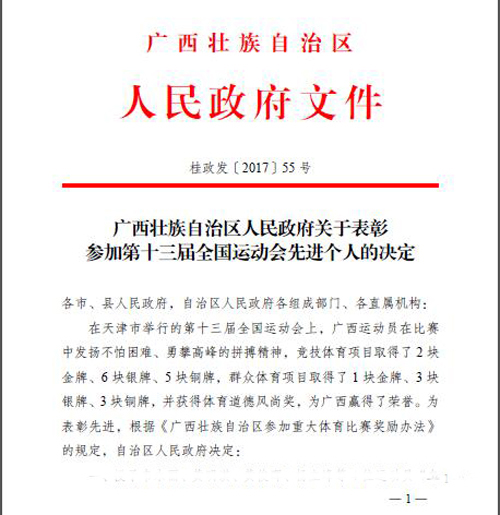 近日,第十三届全运会广西代表团总结大会在南宁召开。会议肯定了我区体育健儿在本届全运会上不畏强手、顽强拼搏的精神。同时,宣布了自治区政府开元网页版登录入口表彰全运会先进个人的决定。