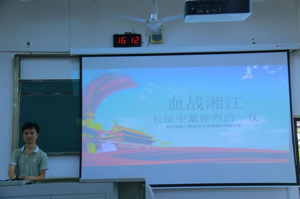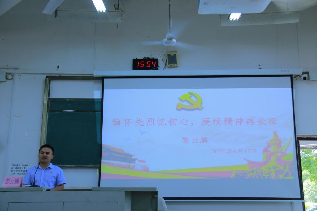 随后,三位支部代表进行发言,分享各自在湘江战役纪念馆的所听、所闻、所感。他们分别是来自教职工支部的黎云鹏同志、来自学生一支部的韦运垌同志、以及来自学生二支部的赵海运同志。其中黎云鹏同志将历史与我们的学习、工作相结合,表示要将中国共产党人的力量和智慧与工作实际相结合,实现党史学习教育与专业学习、教书育人的同频共振。韦运垌同志分享了其在参观红军湘江战役纪念馆时的深刻感受,表示今日的幸福生活来之不易,我们应该倍加珍惜。赵海运同志以湘江战役与长征的关系为开头,引入对湘江战役的介绍,使得我院师生对于这段历史更加清晰明了。