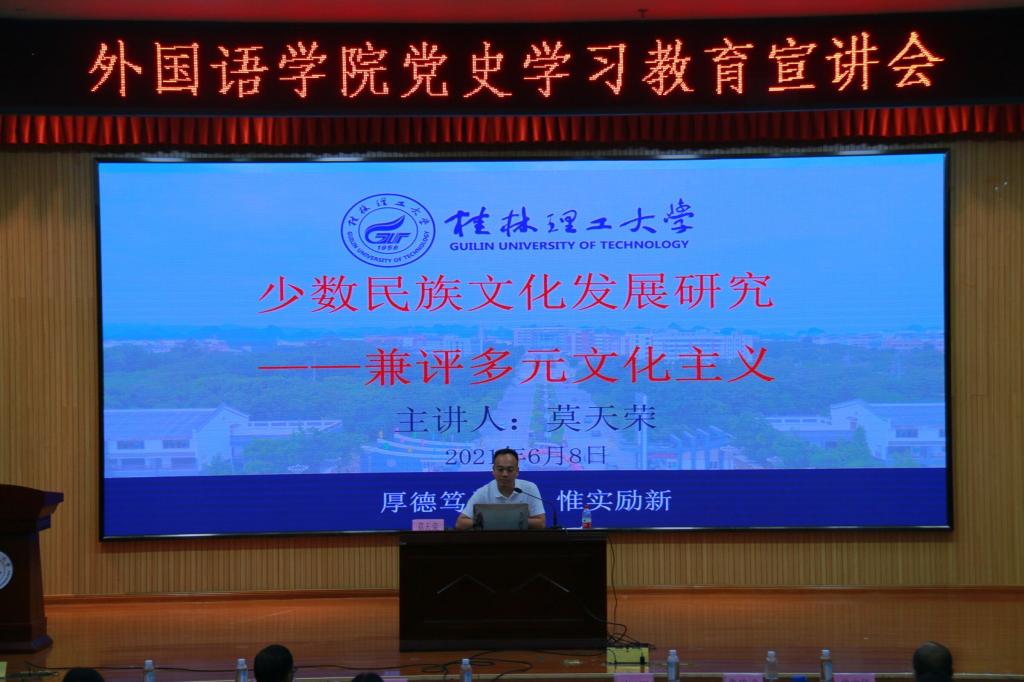 会议伊始,曾任旅游开元(中国)党委书记的李少游教授讲授“了解桂工历史,弘扬桂工精神”主题党课,主要讲述了习近平论“四史”教育和桂工精神,从“四史”教育方面引至我校桂工精神的特征与意义。李书记以自身经历为基础,向大家讲述了桂工前辈们的艰苦创业的高贵品质和桂工精神的发展与伟大,同时呼吁大家要牢记桂工精神,传承桂工精神。紧接着,由马克思主义开元(中国)院长助理、党委宣传委员莫天荣博士讲授“少数民族文化研究——兼评多元文化主义”主题党课,他简述了我国少数民族文化的发展概况以及面临的挑战与机遇,与西方文化做对比,启示大家积极学习和传承好中华优秀传统文化,并结合党史事实,鼓励大家在实践中学习和感悟。