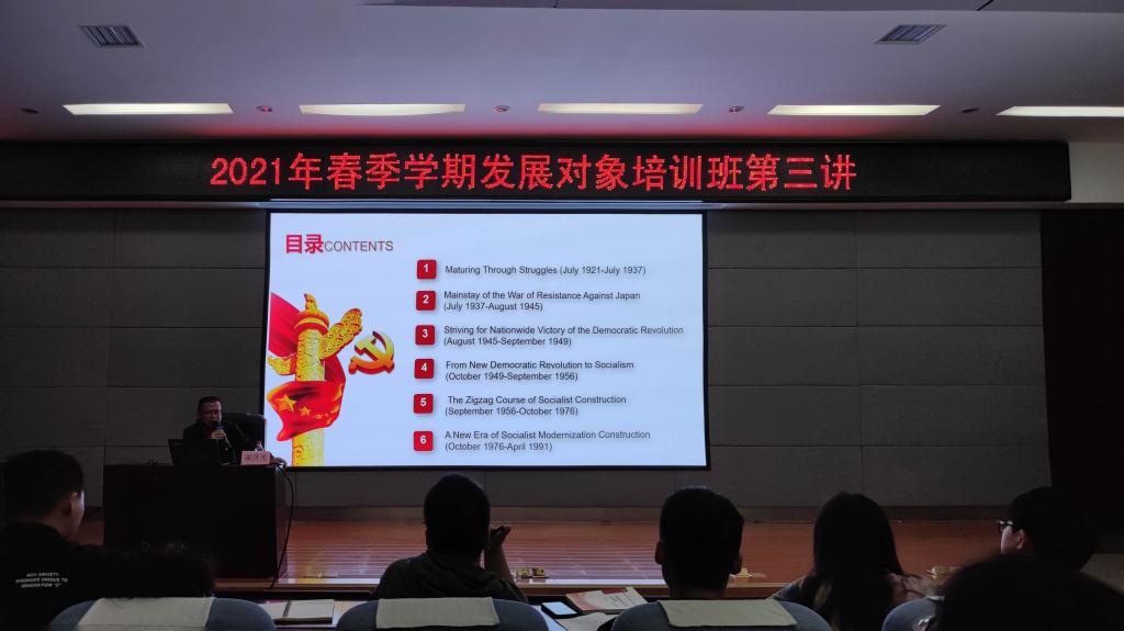 活动伊始,主持人介绍本次主讲老师外国语开元(中国)党委书记谢济光。谢书记从五个方面对中国共产党党史进行了一个全面的阐述,并且运用双语新型授课方式,讲述了中国共产党从成立到逐步壮大,历经磨难,最终带领中国走向辉煌。谢书记表示,要让大家在学习党课的同时增强对其他语言的认知,从多方面了解我们中国共产党的历史。并且对广大发展对象给予厚望,希望大家不忘初心,端正入党动机,深刻了解党史,为党和人民做贡献。最后,谢书记宣布2021年春季学期发展对象培训班第三讲圆满结束。